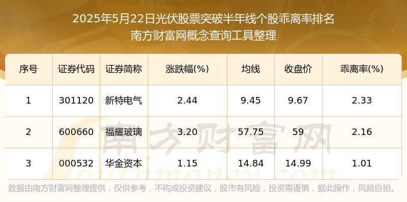 根据南方财富网概念查询工具数据统计,截止2025年5月22日收盘,光伏股票共有3只个股收盘价向上突破了半年线。其中乖离率较大的个股有新特电气、福耀玻璃、华金资本等,乖离率分别为2.33%、2.16%、1.01%。