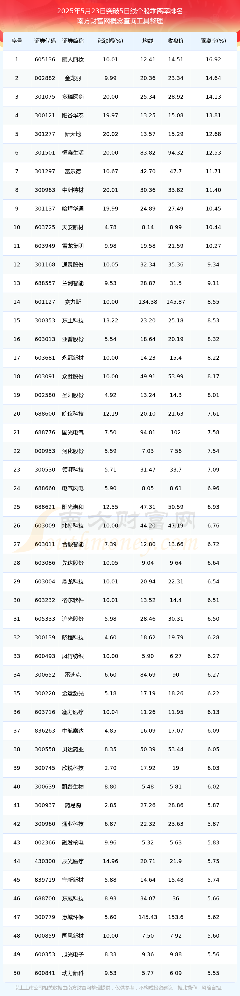 2025年5月23日突破5日线个股乖离率排名