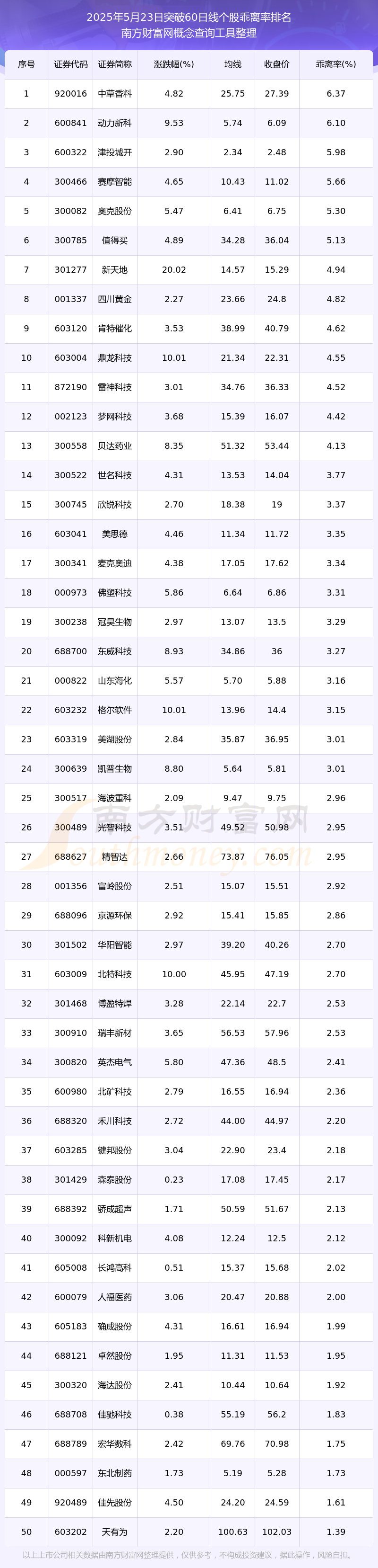 根据南方财富网概念查询工具数据统计,截止2025年5月23日收盘,共有103只个股收盘价向上突破了60日线,其中乖离率较大的个股有中草香料、动力新科、津投城开、赛摩智能、奥克股份等,乖离率分别为6.37%、6.10%、5.98%、5.66%、5.30%。 2025年5月23日突破60日