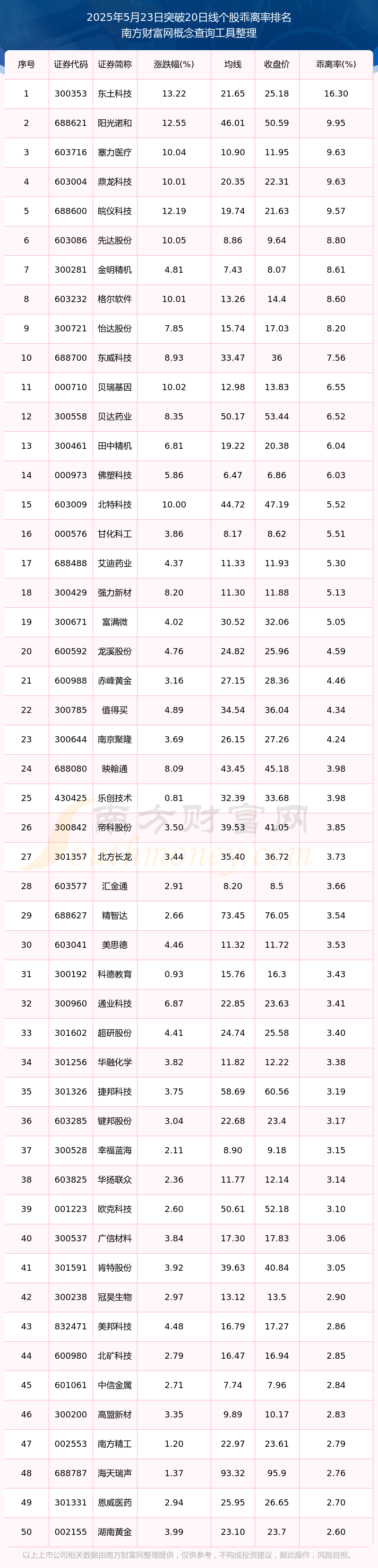 根据南方财富网概念查询工具数据统计,截止2025年5月23日收盘,共有196只个股收盘价向上突破了20日线,其中乖离率较大的个股有东土科技、阳光诺和、塞力医疗、鼎龙科技、皖仪科技等,乖离率分别为16.30%、9.95%、9.63%、9.63%、9.57%。