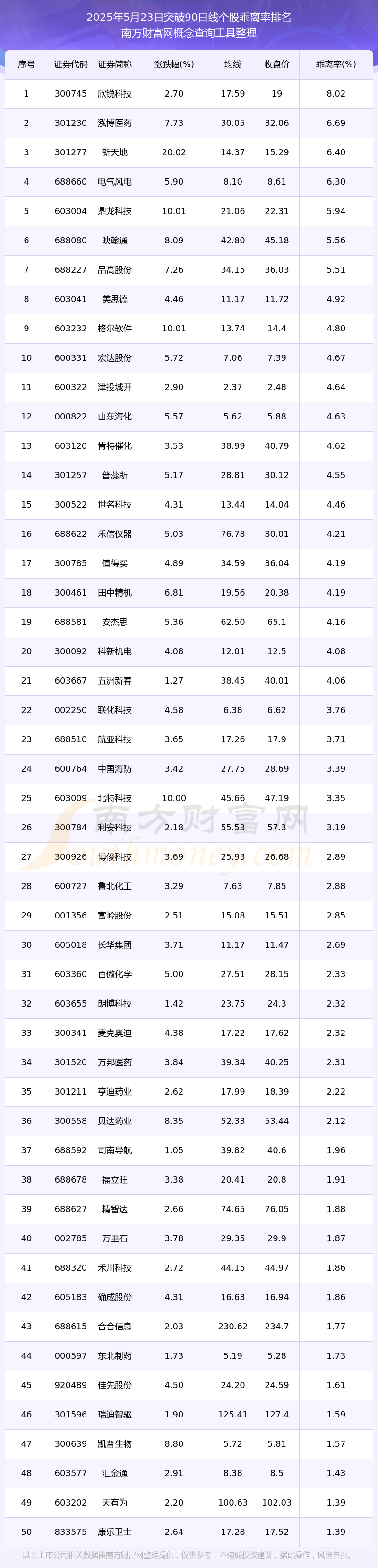根据南方财富网概念查询工具数据统计,截止2025年5月23日收盘,共有92只个股收盘价向上突破了90日线,其中乖离率较大的个股有欣锐科技、泓博医药、新天地、电气风电、鼎龙科技等,乖离率分别为8.02%、6.69%、6.40%、6.30%、5.94%。