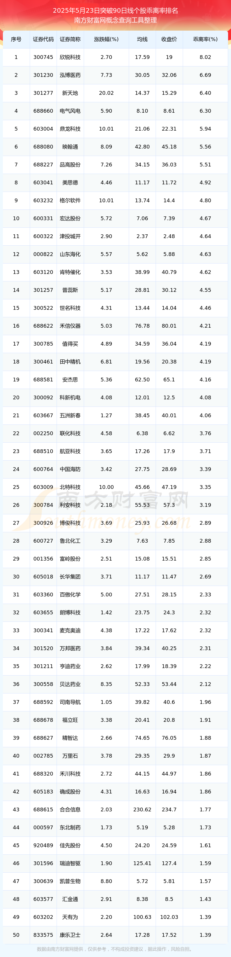 2025年5月23日突破90日线个股乖离率排名