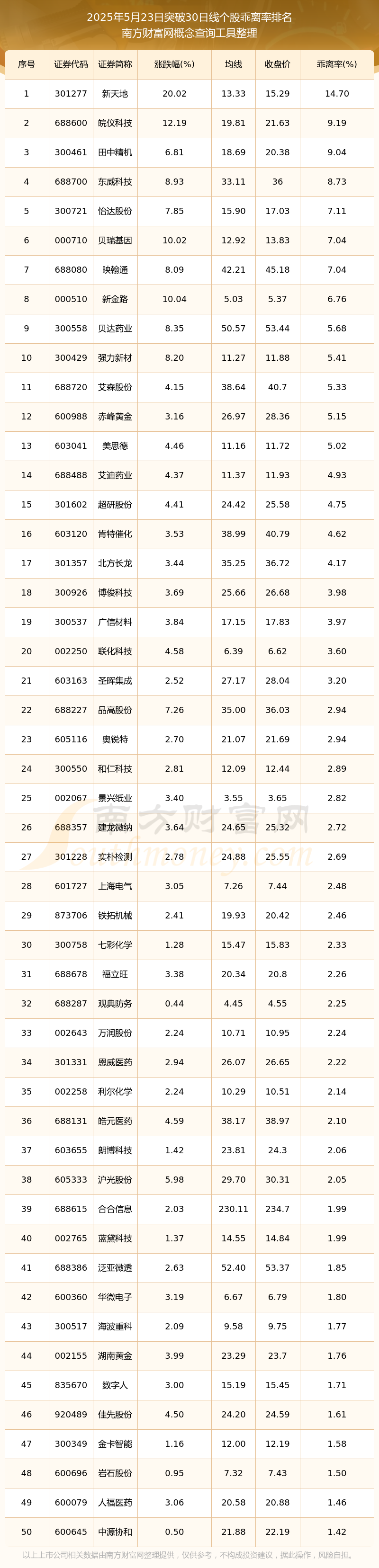 2025年5月23日突破30日线个股乖离率排名