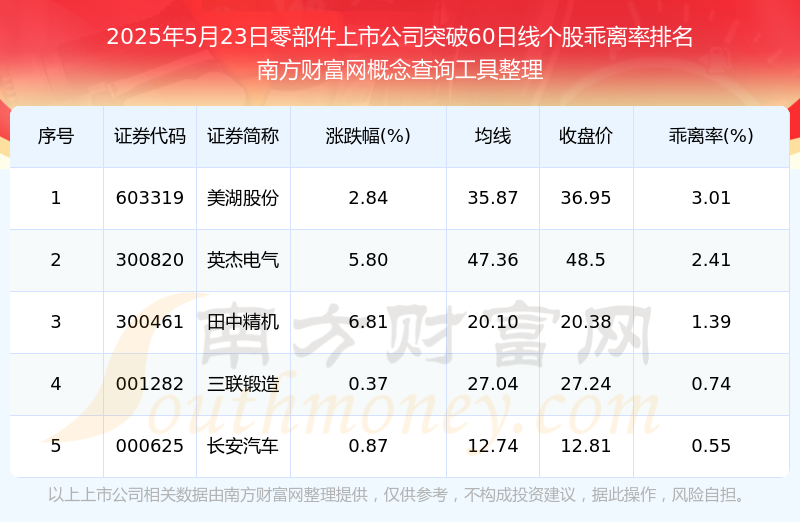 根据南方财富网概念查询工具数据统计,截止2025年5月23日收盘,零部件上市公司共有5只个股收盘价向上突破了60日线。其中乖离率较大的个股有美湖股份、英杰电气、田中精机等,乖离率分别为3.01%、2.41%、1.39%。