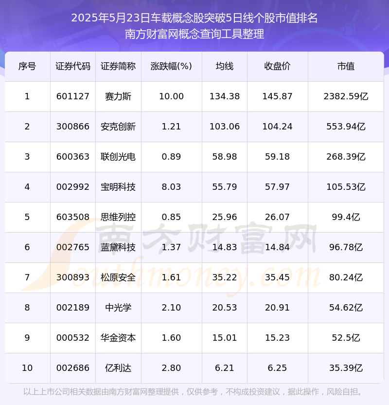 根据南方财富网概念查询工具数据统计,截止2025年5月23日收盘,车载概念股共有13只个股收盘价向上突破了5日线。其中市值较大的个股有赛力斯、安克创新、联创光电等,市值分别为2382.59亿、553.94亿、268.39亿。