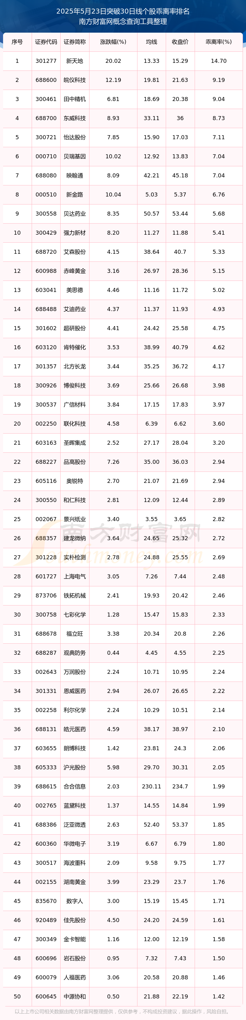2025年5月23日突破30日线个股乖离率排名
