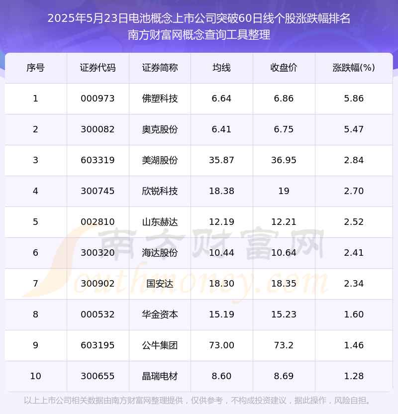 根据南方财富网概念查询工具数据统计,截止2025年5月23日收盘,电池概念上市公司共有16只个股收盘价向上突破了60日线。其中涨幅较大的个股有佛塑科技、奥克股份、美湖股份等,涨幅分别为5.86%、5.47%、2.84%。