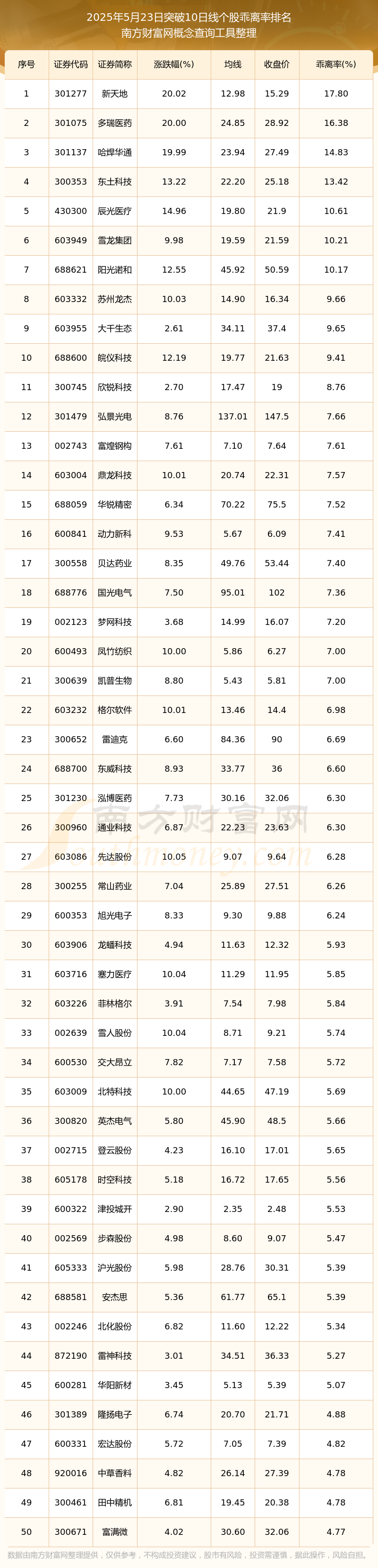 根据南方财富网概念查询工具数据统计,截止2025年5月23日收盘,共有305只个股收盘价向上突破了10日线,其中乖离率较大的个股有新天地、多瑞医药、哈焊华通、东土科技、辰光医疗等,乖离率分别为17.80%、16.38%、14.83%、13.42%、10.61%。