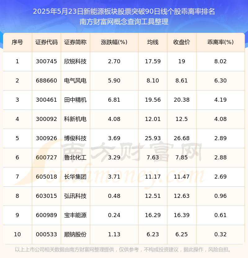 根据南方财富网概念查询工具数据统计,截止2025年5月23日收盘,新能源板块股票共有12只个股收盘价向上突破了90日线。其中乖离率较大的个股有欣锐科技、电气风电、田中精机等,乖离率分别为8.02%、6.30%、4.19%。