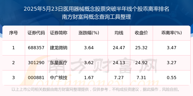 根据南方财富网概念查询工具数据统计,截止2025年5月23日收盘,医用器械概念股票共有3只个股收盘价向上突破了半年线。其中乖离率较大的个股有建龙微纳、东星医疗、中广核技等,乖离率分别为3.47%、3.27%、0.55%。