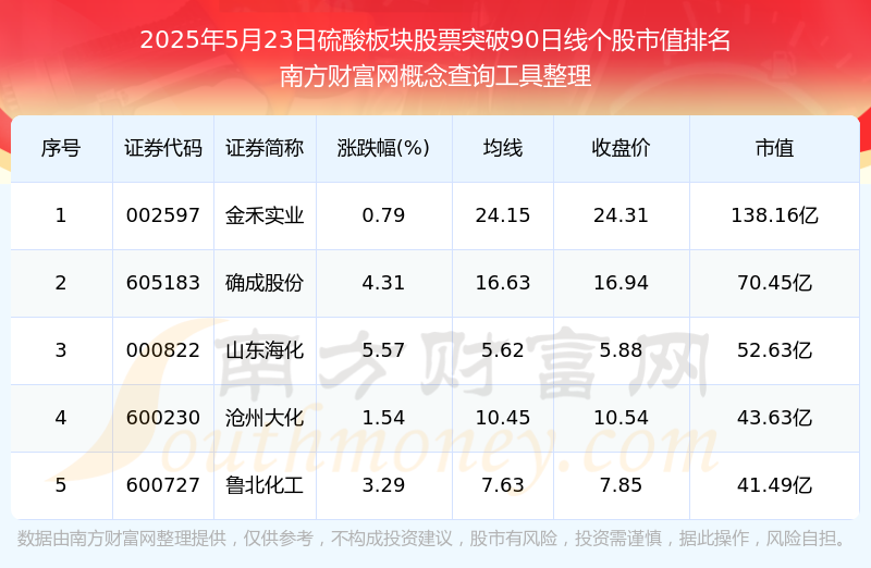 2025年5月23日硫酸板块股票突破90日线个股市值排名