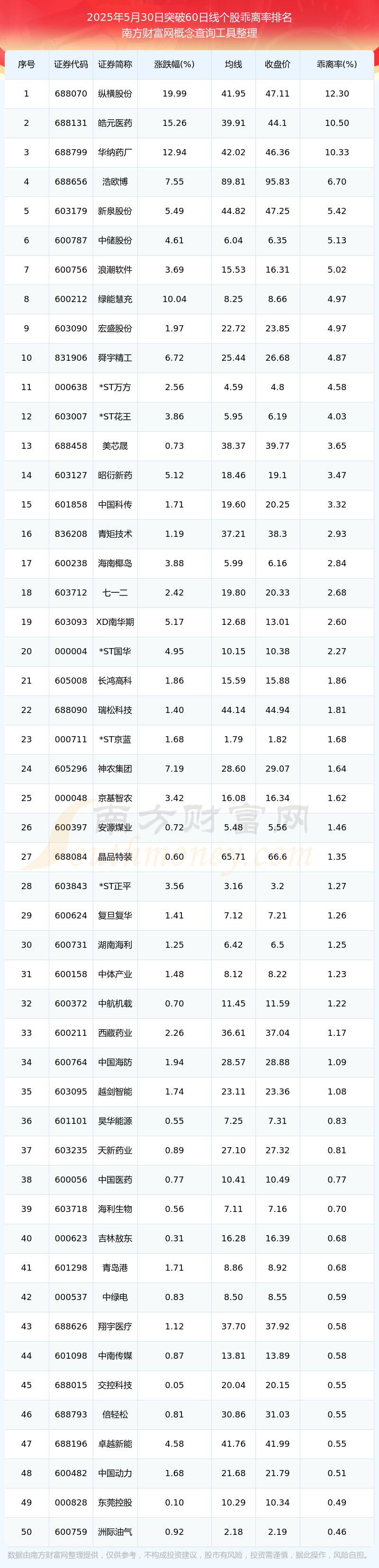 2025年5月30日突破60日线个股乖离率排名