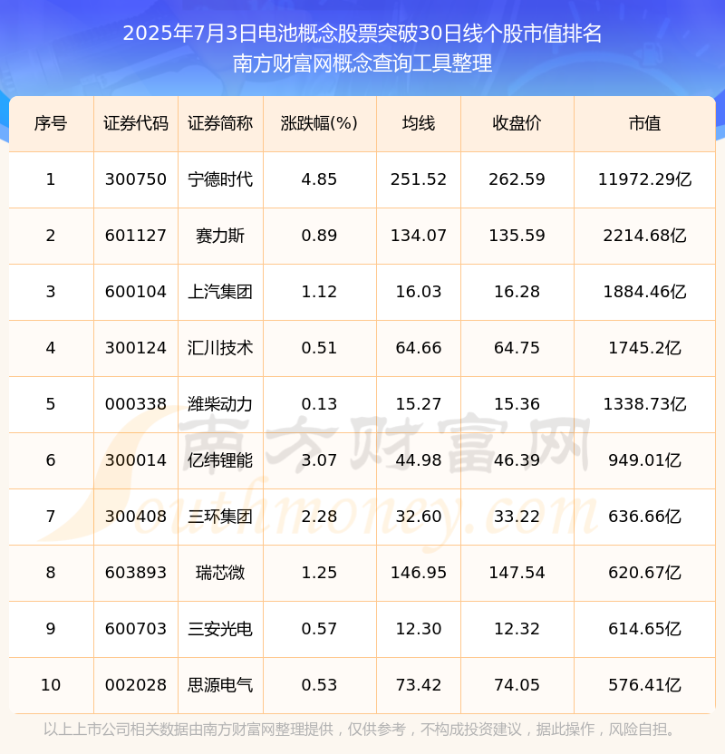 2025年7月3日电池概念股票突破30日线个股市值排名