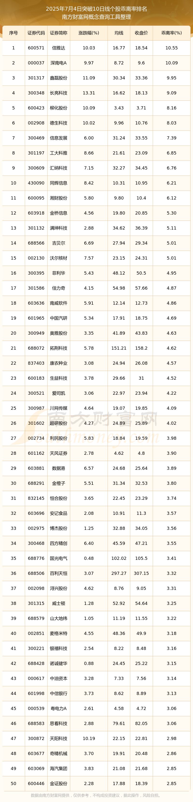 根据南方财富网概念查询工具数据统计,截止2025年7月4日收盘,共有222只个股收盘价向上突破了10日线,其中乖离率较大的个股有信雅达、深南电A、鑫磊股份、长亮科技、柳化股份等,乖离率分别为10.55%、10.09%、9.95%、9.09%、8.16%。