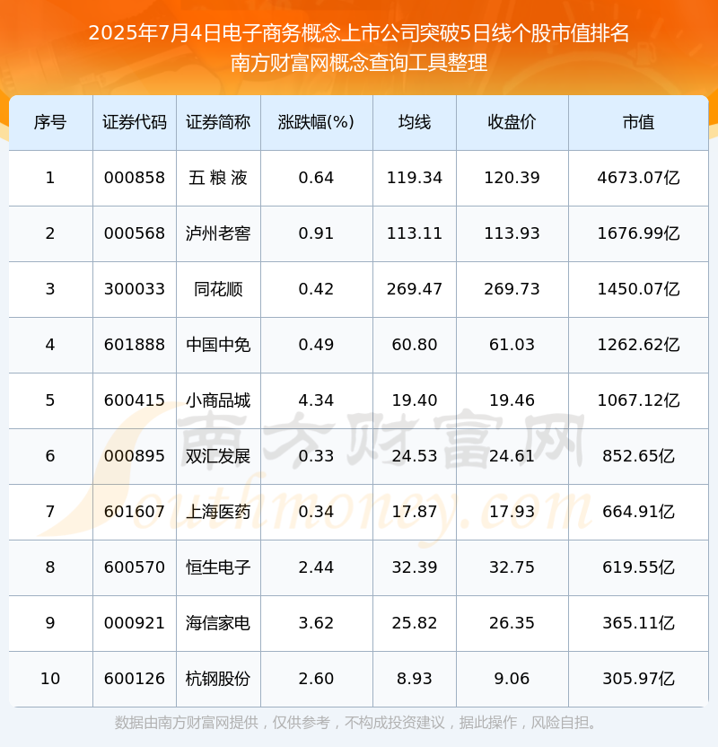 2025年7月4日电子商务概念上市公司突破5日线个股市值排名