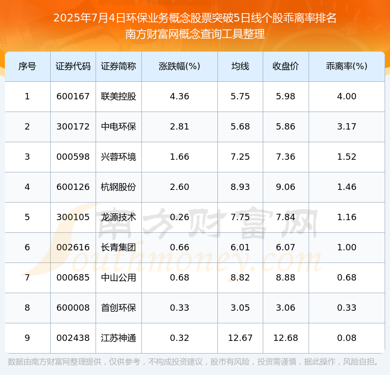 根据南方财富网概念查询工具数据统计,截止2025年7月4日收盘,环保业务概念股票共有9只个股收盘价向上突破了5日线。其中乖离率较大的个股有联美控股、中电环保、兴蓉环境等,乖离率分别为4.00%、3.17%、1.52%。