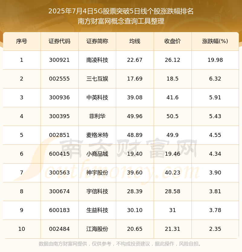 根据南方财富网概念查询工具数据统计,截止2025年7月4日收盘,5G股票共有26只个股收盘价向上突破了5日线。其中涨幅较大的个股有南凌科技、三七互娱、中英科技等,涨幅分别为19.98%、6.32%、5.91%。