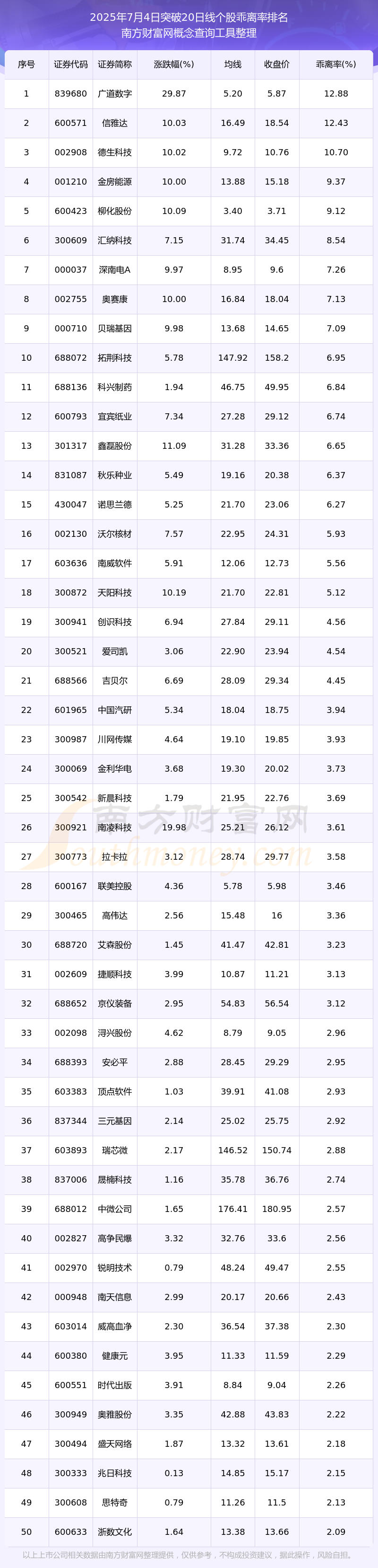 2025年7月4日突破20日线个股乖离率排名