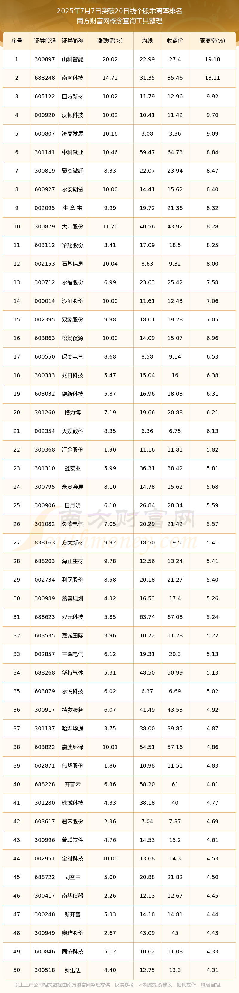 2025年7月7日突破20日线个股乖离率排名