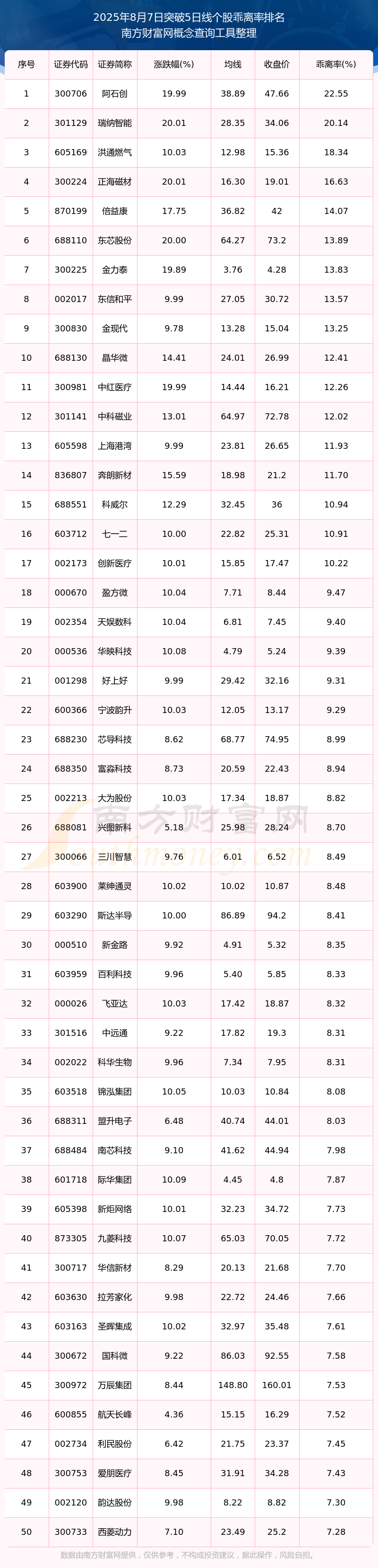 2025年8月7日突破5日线个股乖离率排名