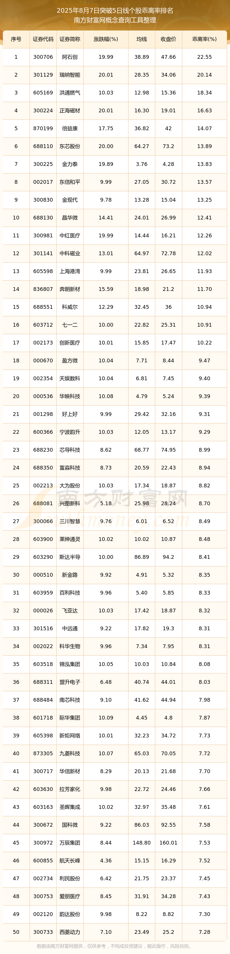 2025年8月7日突破5日线个股乖离率排名
