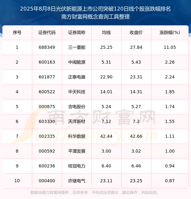 根据南方财富网概念查询工具数据统计,截止2025年8月8日收盘,光伏新能源上市公司共有15只个股收盘价向上突破了120日线。其中涨幅较大的个股有三一重能、中闽能源、正泰电器等,涨幅分别为11.05%、2.26%、2.24%。