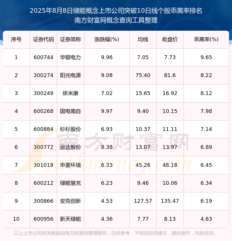 2025年8月8日储能概念上市公司突破10日线个股乖离率排名