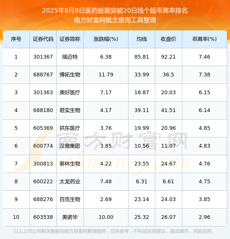根据南方财富网概念查询工具数据统计,截止2025年8月8日收盘,医药股票共有75只个股收盘价向上突破了20日线。其中乖离率较大的个股有瑞迈特、博拓生物、美好医疗等,乖离率分别为7.46%、7.38%、6.15%。