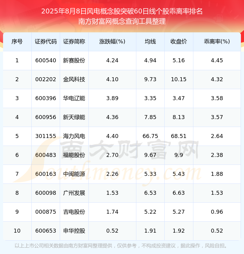 根据南方财富网概念查询工具数据统计,截止2025年8月8日收盘,风电概念股共有18只个股收盘价向上突破了60日线。其中乖离率较大的个股有新赛股份、金风科技、华电辽能等,乖离率分别为4.45%、4.32%、3.58%。