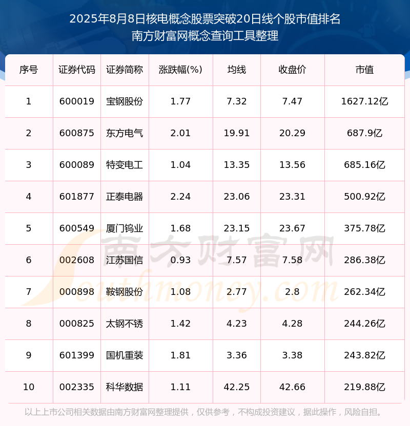 2025年8月8日核电概念股票突破20日线个股市值排名