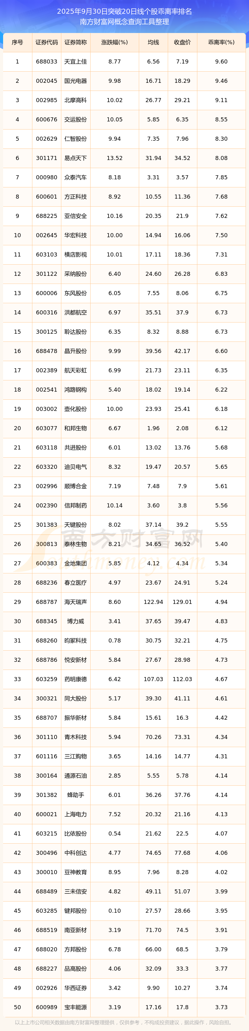 根据南方财富网概念查询工具数据统计,截止2025年9月30日收盘,共有436只个股收盘价向上突破了20日线,其中乖离率较大的个股有天宜上佳、国光电器、北摩高科、交运股份、仁智股份等,乖离率分别为9.60%、9.46%、9.11%、8.55%、8.30%。