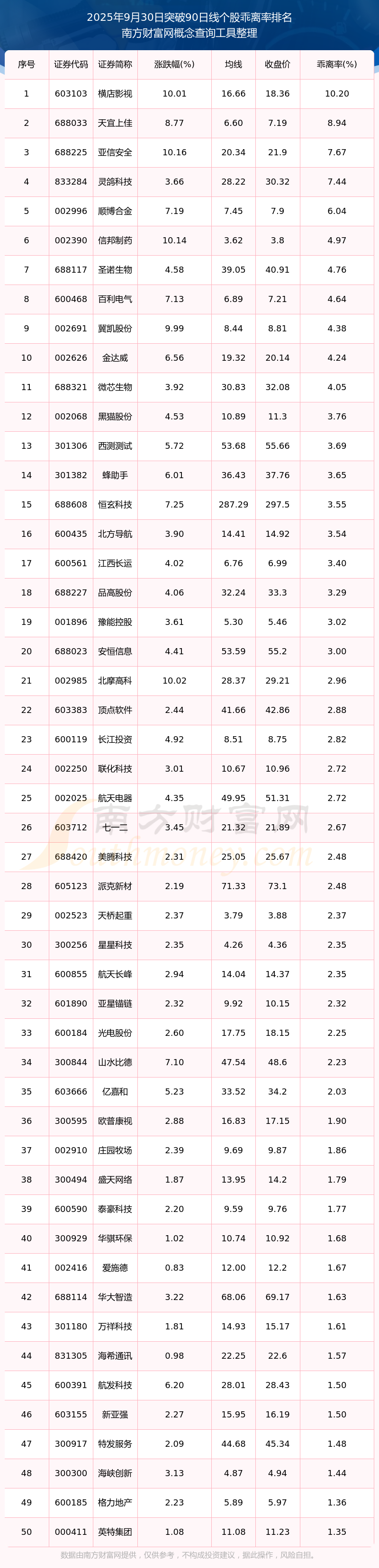 根据南方财富网概念查询工具数据统计,截止2025年9月30日收盘,共有168只个股收盘价向上突破了90日线,其中乖离率较大的个股有横店影视、天宜上佳、亚信安全、灵鸽科技、顺博合金等,乖离率分别为10.20%、8.94%、7.67%、7.44%、6.04%。