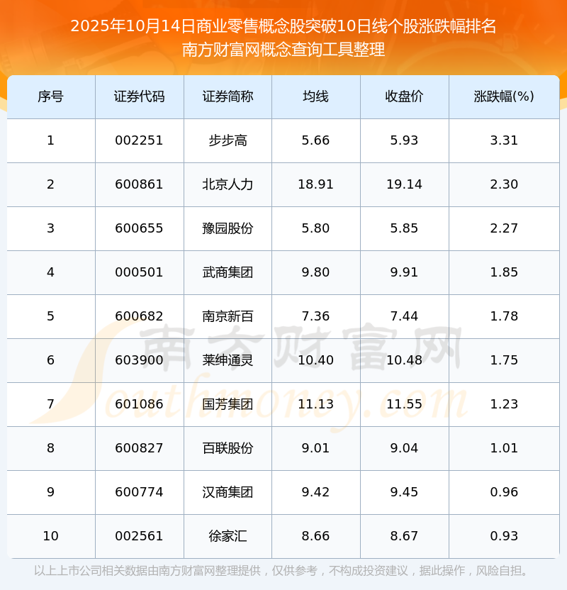 2025年10月14日商业零售概念股突破10日线个股涨跌幅排名
