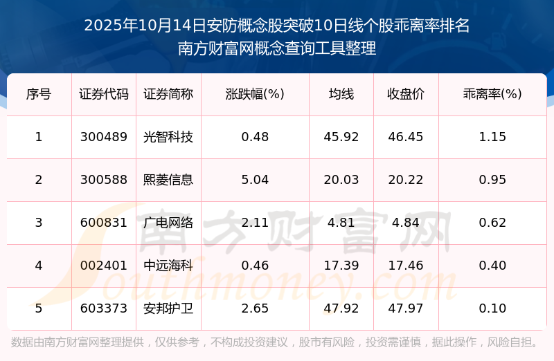 根据南方财富网概念查询工具数据统计,截止2025年10月14日收盘,安防概念股共有5只个股收盘价向上突破了10日线。其中乖离率较大的个股有光智科技、熙菱信息、广电网络等,乖离率分别为1.15%、0.95%、0.62%。