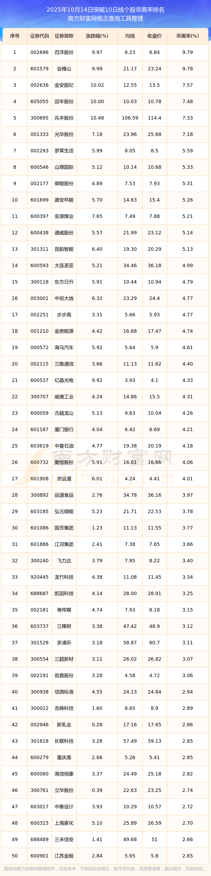 根据南方财富网概念查询工具数据统计,截止2025年10月14日收盘,共有360只个股收盘价向上突破了10日线,其中乖离率较大的个股有百洋股份、会稽山、金安国纪、迎丰股份、兆丰股份等,乖离率分别为9.79%、9.78%、7.57%、7.48%、7.33%。