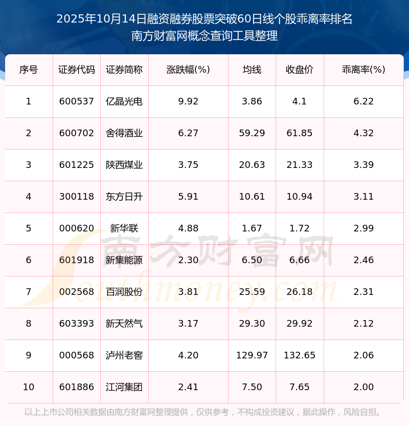 2025年10月14日融资融券股票突破60日线个股乖离率排名