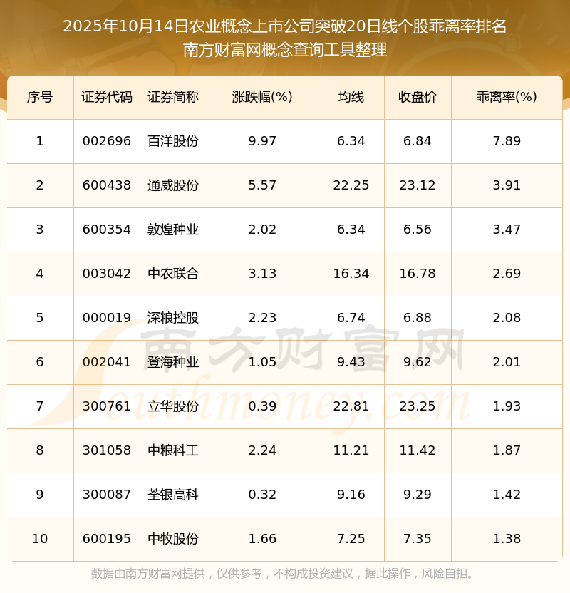 2025年10月14日农业概念上市公司突破20日线个股乖离率排名