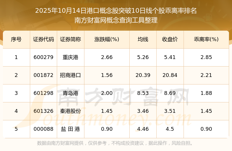 根据南方财富网概念查询工具数据统计,截止2025年10月14日收盘,港口概念股共有5只个股收盘价向上突破了10日线。其中乖离率较大的个股有重庆港、招商港口、青岛港等,乖离率分别为2.85%、2.21%、1.88%。