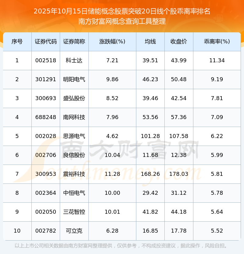 2025年10月15日储能概念股票突破20日线个股乖离率排名