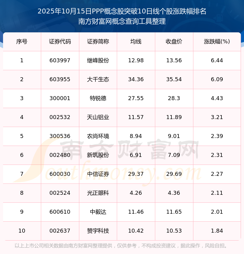 根据南方财富网概念查询工具数据统计,截止2025年10月15日收盘,PPP概念股共有39只个股收盘价向上突破了10日线。其中涨幅较大的个股有继峰股份、大千生态、特锐德等,涨幅分别为6.44%、6.09%、4.43%。