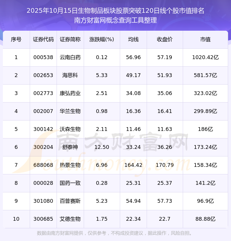2025年10月15日生物制品板块股票突破120日线个股市值排名