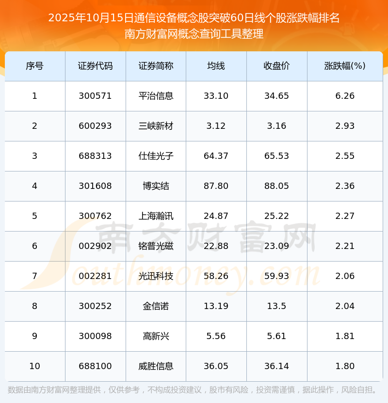 根据南方财富网概念查询工具数据统计,截止2025年10月15日收盘,通信设备概念股共有13只个股收盘价向上突破了60日线。其中涨幅较大的个股有平治信息、三峡新材、仕佳光子等,涨幅分别为6.26%、2.93%、2.55%。