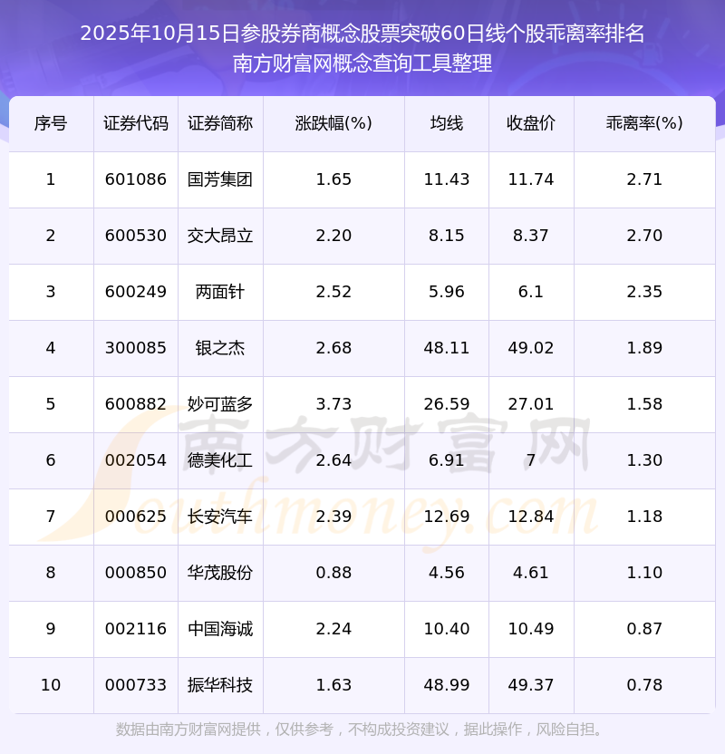 2025年10月15日参股券商概念股票突破60日线个股乖离率排名