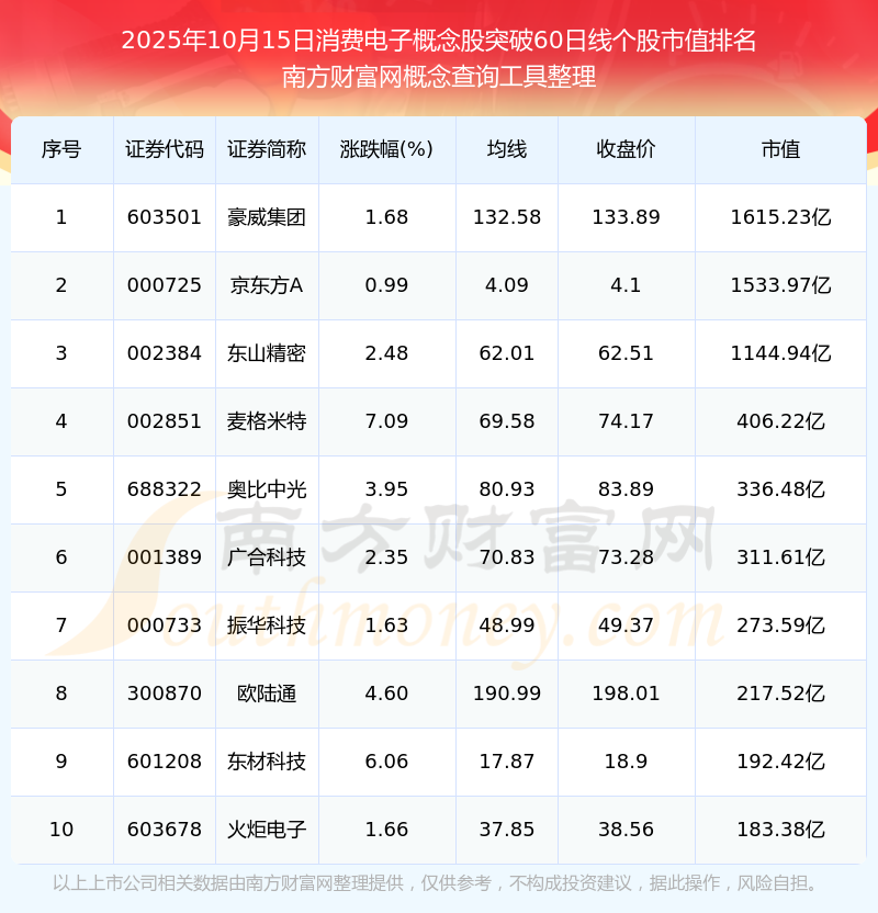 2025年10月15日消费电子概念股突破60日线个股市值排名