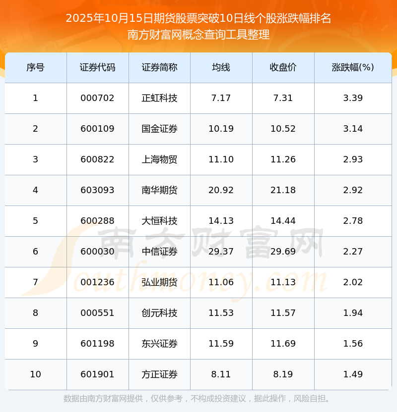 根据南方财富网概念查询工具数据统计,截止2025年10月15日收盘,期货股票共有29只个股收盘价向上突破了10日线。其中涨幅较大的个股有正虹科技、国金证券、上海物贸等,涨幅分别为3.39%、3.14%、2.93%。