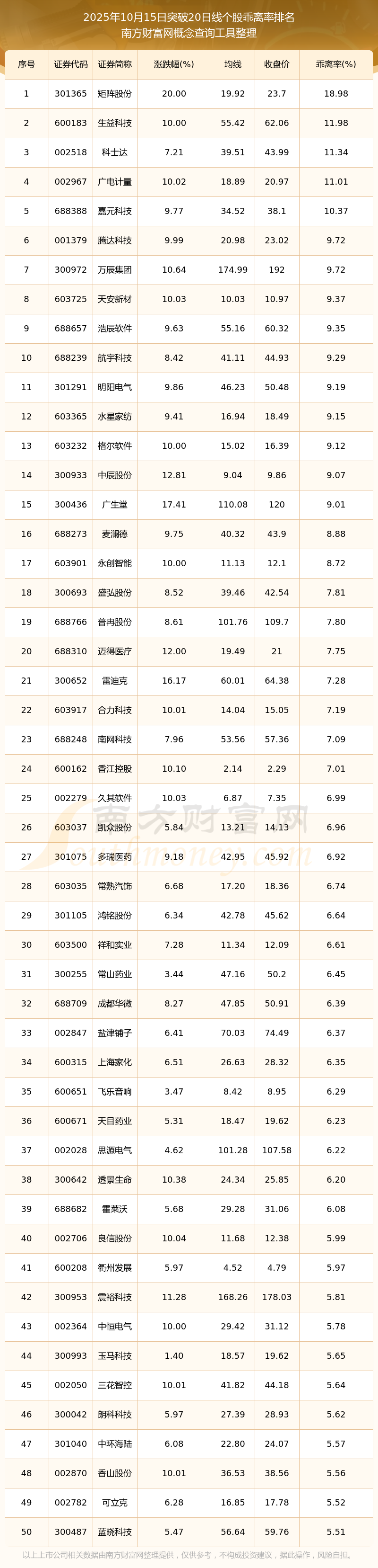 2025年10月15日突破20日线个股乖离率排名