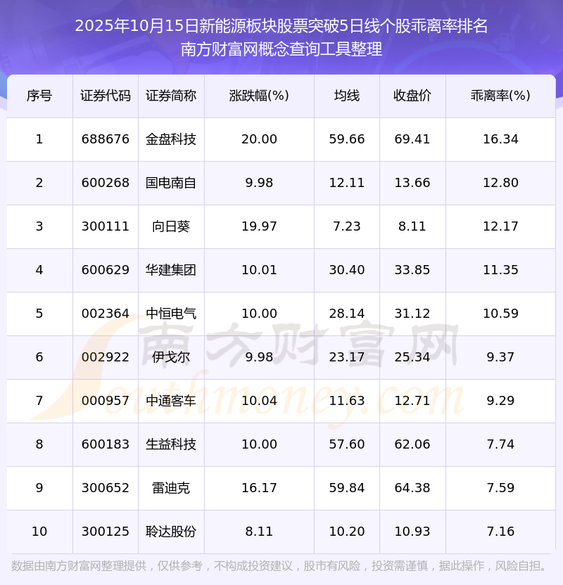 根据南方财富网概念查询工具数据统计,截止2025年10月15日收盘,新能源板块股票共有286只个股收盘价向上突破了5日线。其中乖离率较大的个股有金盘科技、国电南自、向日葵等,乖离率分别为16.34%、12.80%、12.17%。