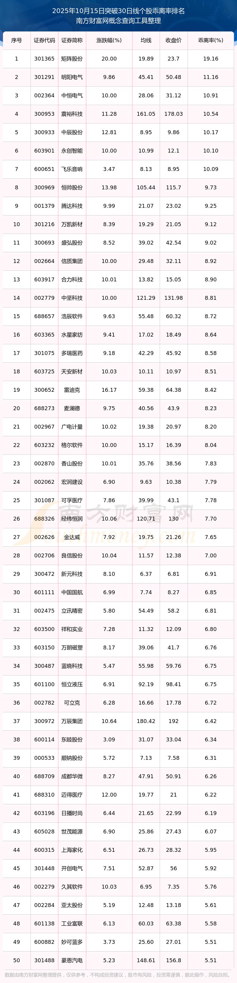 根据南方财富网概念查询工具数据统计,截止2025年10月15日收盘,共有616只个股收盘价向上突破了30日线,其中乖离率较大的个股有矩阵股份、明阳电气、中恒电气、震裕科技、中辰股份等,乖离率分别为19.16%、11.16%、10.91%、10.54%、10.17%。