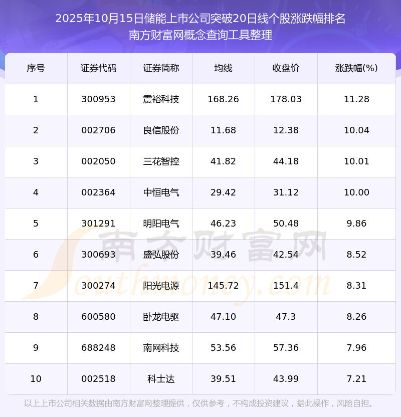 2025年10月15日储能上市公司突破20日线个股涨跌幅排名