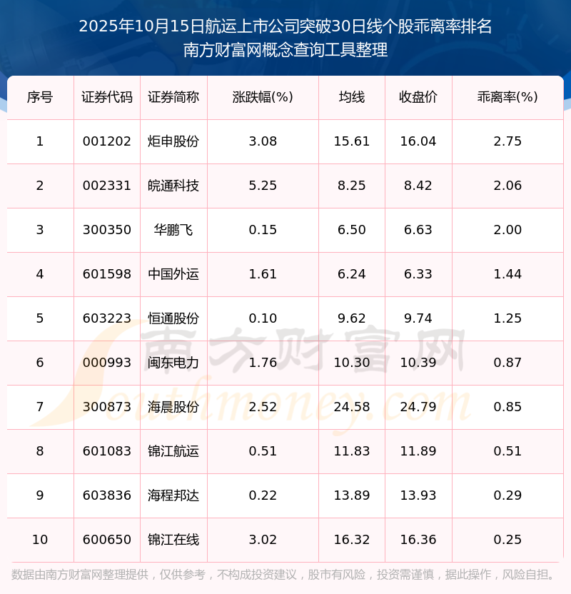 2025年10月15日航运上市公司突破30日线个股乖离率排名